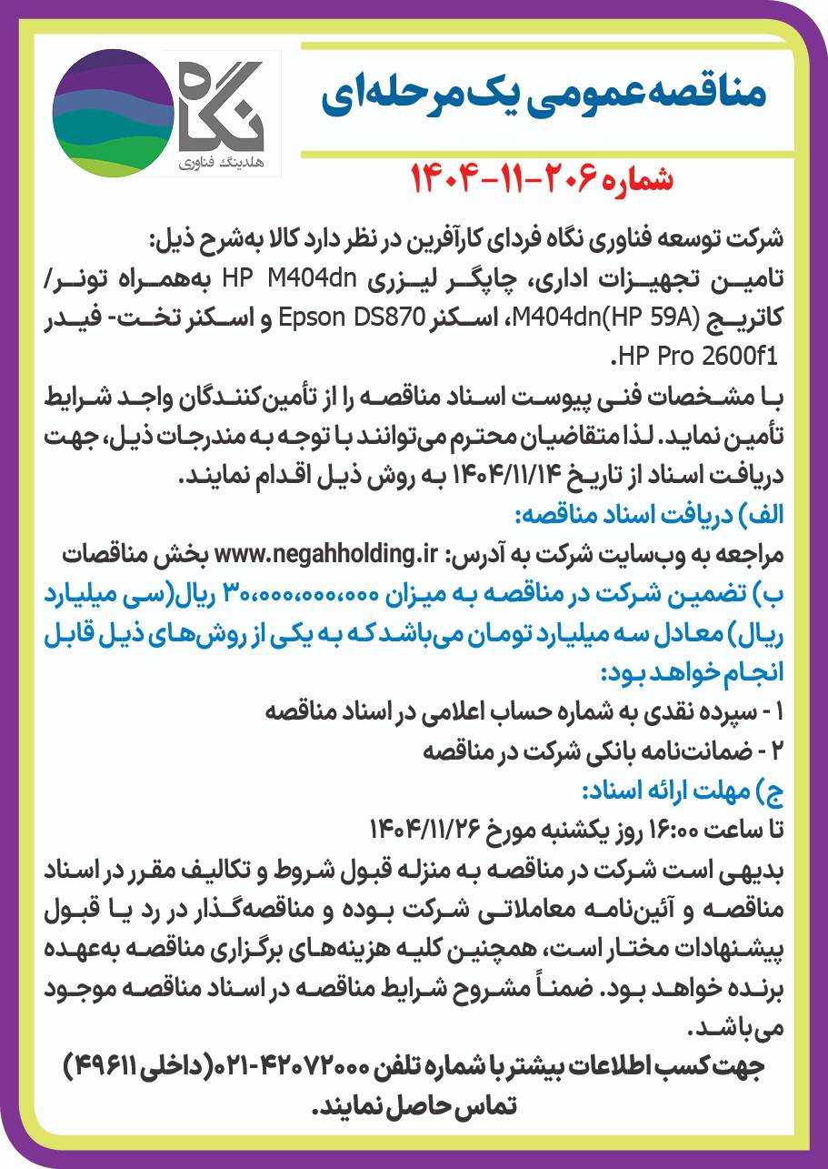 بهمن ۱۴, ۱۴۰۴ شرکت فناوری نگاه فردای کارآفرین در نظر دارد جهت خرید تجهیزات اداری از طریق مناقصه عمومی اقدام نماید. از کلیه شرکتها و تأمینکنندگان معتبر دعوت میشود تا پیشنهادات خود را مطابق با شرایط ذیل ارائه نمایند. نسخه پیش نویس قرارداد خرید تجهیزات اداری اسناد شرایط مناقصه خرید تجهیزات اداری