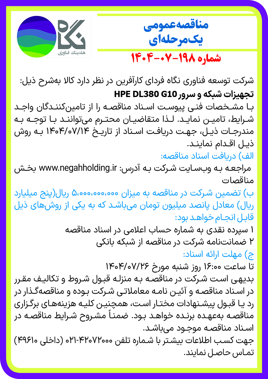 مهر ۱۵, ۱۴۰۴ شرکت فناوری نگاه فردای کارآفرین در نظر دارد جهت خرید تجهیزات شبکه و سرور HPE DL380 G10 از طریق مناقصه عمومی اقدام نماید. از کلیه شرکتها و تأمینکنندگان معتبر دعوت میشود تا پیشنهادات خود را مطابق با شرایط ذیل ارائه نمایند. نسخه پیش نویس قرارداد خرید تجهیزات شبکه و سرور HPE DL380 G10 اسناد شرایط مناقصه خرید تجهیزات شبکه و سرور HPE DL380 G10
